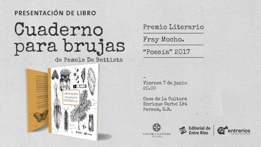 El próximo viernes a las 20, se presentará en Casa de la Cultura de Entre Ríos el libro ganador de la última edición del Fray Mocho, el premio literario más importante de la provincia. Se trata de Cuaderno para brujas, libro de poemas de Pamela de Battista. El acceso es libre y gratuito.