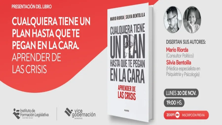 El Instituto de Formación Legislativa de la Vicegobernación de Entre Ríos invita a la presentación del libro “Cualquiera tiene un plan hasta que te pegan en la cara. Aprender de las crisis”, La presentación estará a cargo de la vicegobernadora, Laura Stratta y contará con la participación del consultor político Mario Riorda y la médica psiquiatra del equipo de Emergencia Sanitaria Silvia Bentolila, ambos autores del libro.