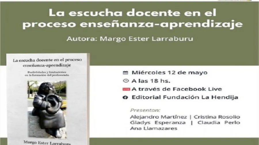 El próximo miércoles 12 de mayo a las 18; Editorial Fundación la Hendija realizará la presentación online del libro “La escucha docente en el proceso de enseñanza- aprendizaje” de Margo Ester Larraburu. La propuesta contará con la presentación y participación de Alejandro Martínez, Cristina Rosolio, Gladys Esperanza, Claudia Perlo y Ana Llamazares. La actividad se llevará adelante en la plataforma de Facebook de Editorial Fundación La Hendija.