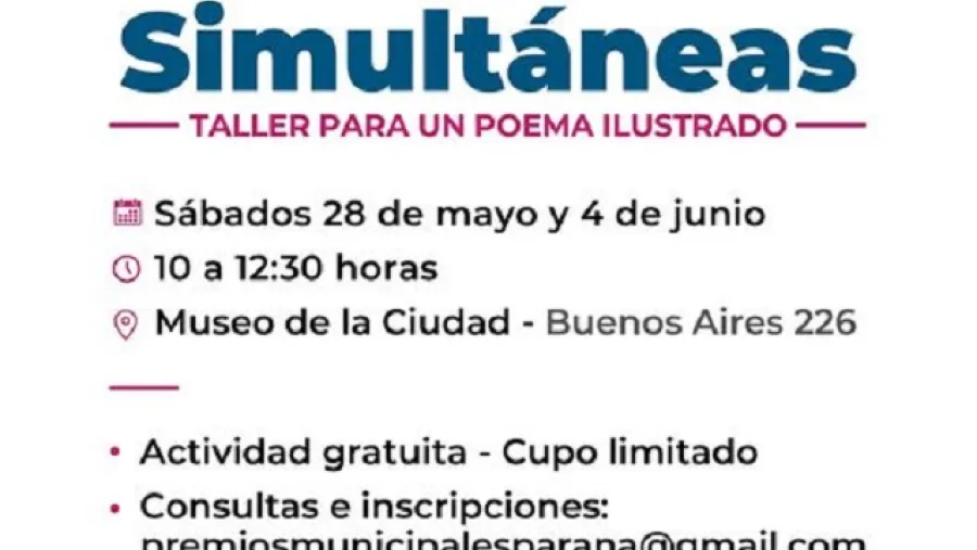 Se dictará los días 28 de mayo y 4 de junio, de 10 a 12,30, en el Museo de la Ciudad (Buenos Aires 226). Las consultas e inscripciones se reciben al correo: premiosmunicipalesparana@gmail.com, con el asunto: Taller Poema Ilustrado.