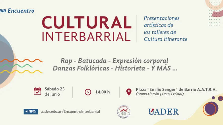 Junto a la comisión vecinal AATRA, la UADER invita en Paraná a una jornada donde se podrán apreciar las producciones artísticas de los talleres de Cultura Itinerante que se llevan a cabo en diferentes barrios de la ciudad. Será el sábado 25 de junio, desde las 14, en la Plaza "Emilio Senger". Habrá rap, folklore, batucada, danza urbana, historietas y actividades recreativas para las infancias.