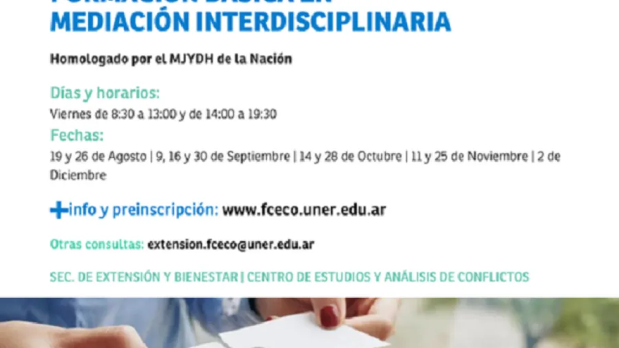 La nueva cohorte del Curso de Formación Básica de Mediadores tendrá como fecha de inicio el viernes 19 de agosto de 2022 en la capital entrerriana. La actividad será coordinada por Mónica Tiraboschi y Melania Peirano. Inscripciones abiertas.