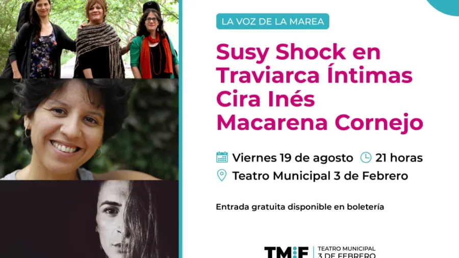 El ciclo que reúne a diferentes disciplinas artísticas se llevará adelante el viernes 19 de agosto a las 21 en el Teatro Municipal 3 de Febrero, con la participación de Susy Shock en Traviarca Íntimas, Cira Inés y Macarena Cornejo.