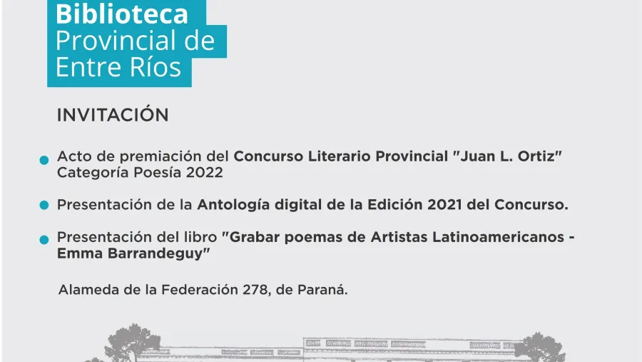 Este miércoles a las 19.30 en la Biblioteca Provincial de Entre Ríos se entregarán los premios del VI Concurso Literario Provincial “Juan L. Ortiz”, tendrá lugar la presentación de la Antología Digital de la Edición 2021 del Concurso, y además se realizará la presentación del libro Grabar poemas de Artistas Latinoamericanas "EMMA BARRANDEGUY" - Estampas del Litoral.