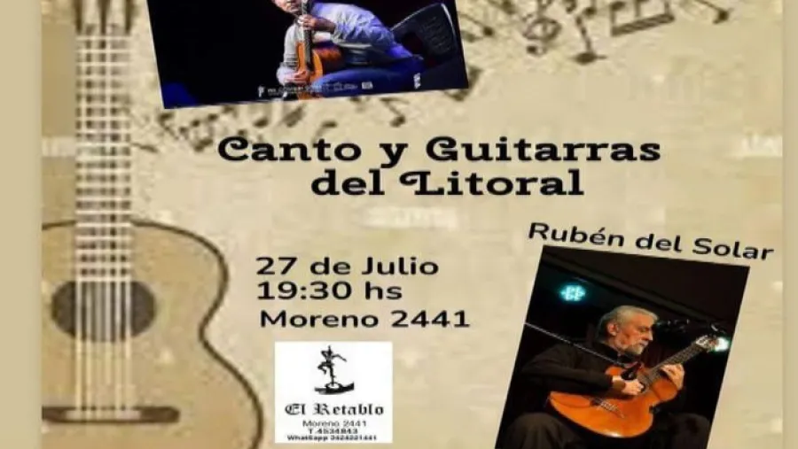 El Retablo, Sala cultural independiente presenta “Canto y Guitarras del Litoral”, un espactulo con Rubén del Solar y Lautaro Molinaro, que interpretarán temas de Walter Heinze, Abel Fleury, Carlos Di Fulvio, Claudio Monterrío, entre otros autores.