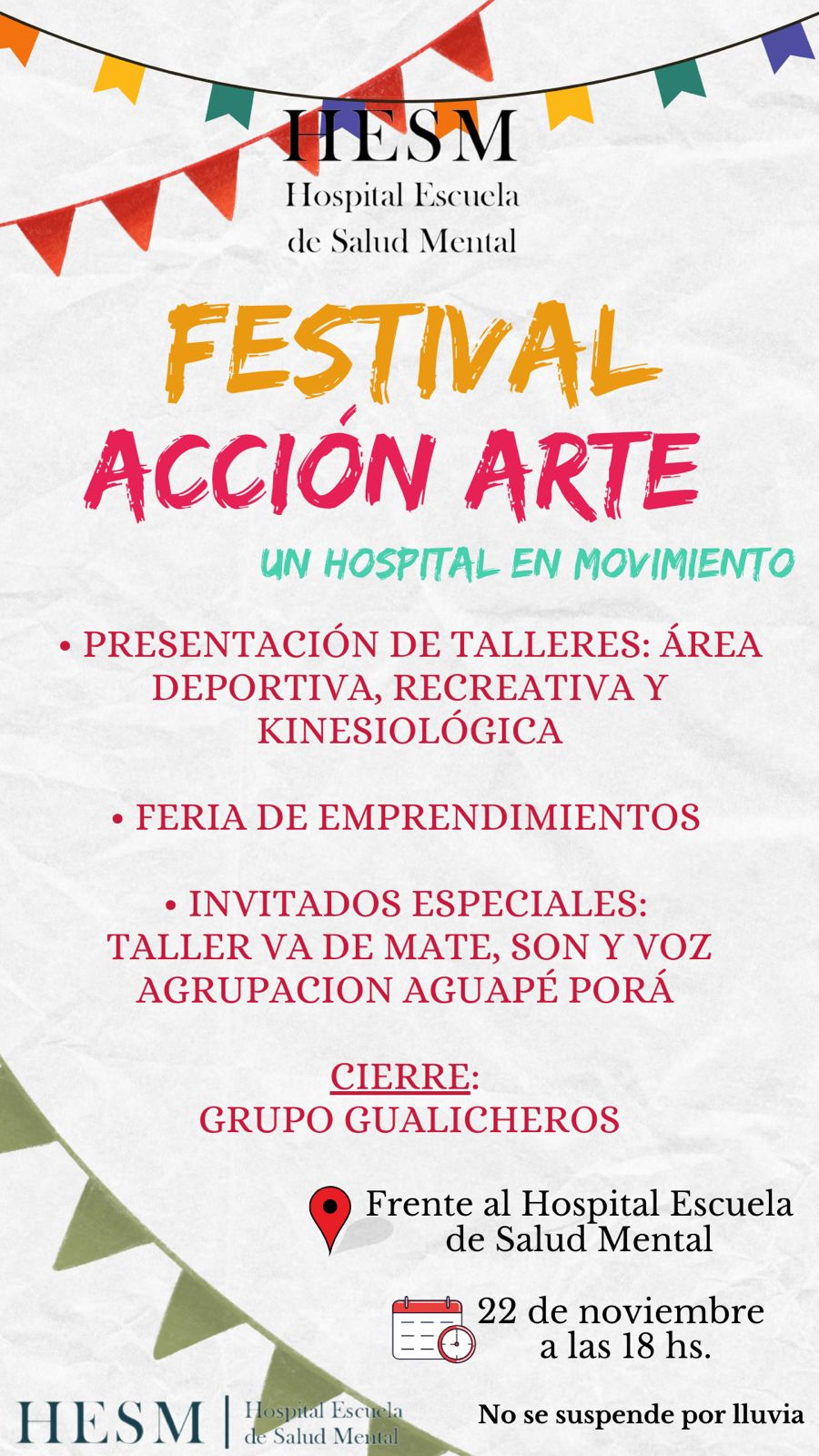 Este viernes 22 de noviembre, a partir de las 18:00, el frente del Hospital Escuela de Salud Mental (Ambrosetti y Rondeau) se convertirá en un espacio de encuentro y celebración con el Festival "Acción Arte. Un Hospital en Movimiento". Toda la comunidad está invitada a participar de esta jornada gratuita que busca compartir las actividades y logros del Área Deportiva, Recreativa y Kinesiológica (ADRyK) del hospital.