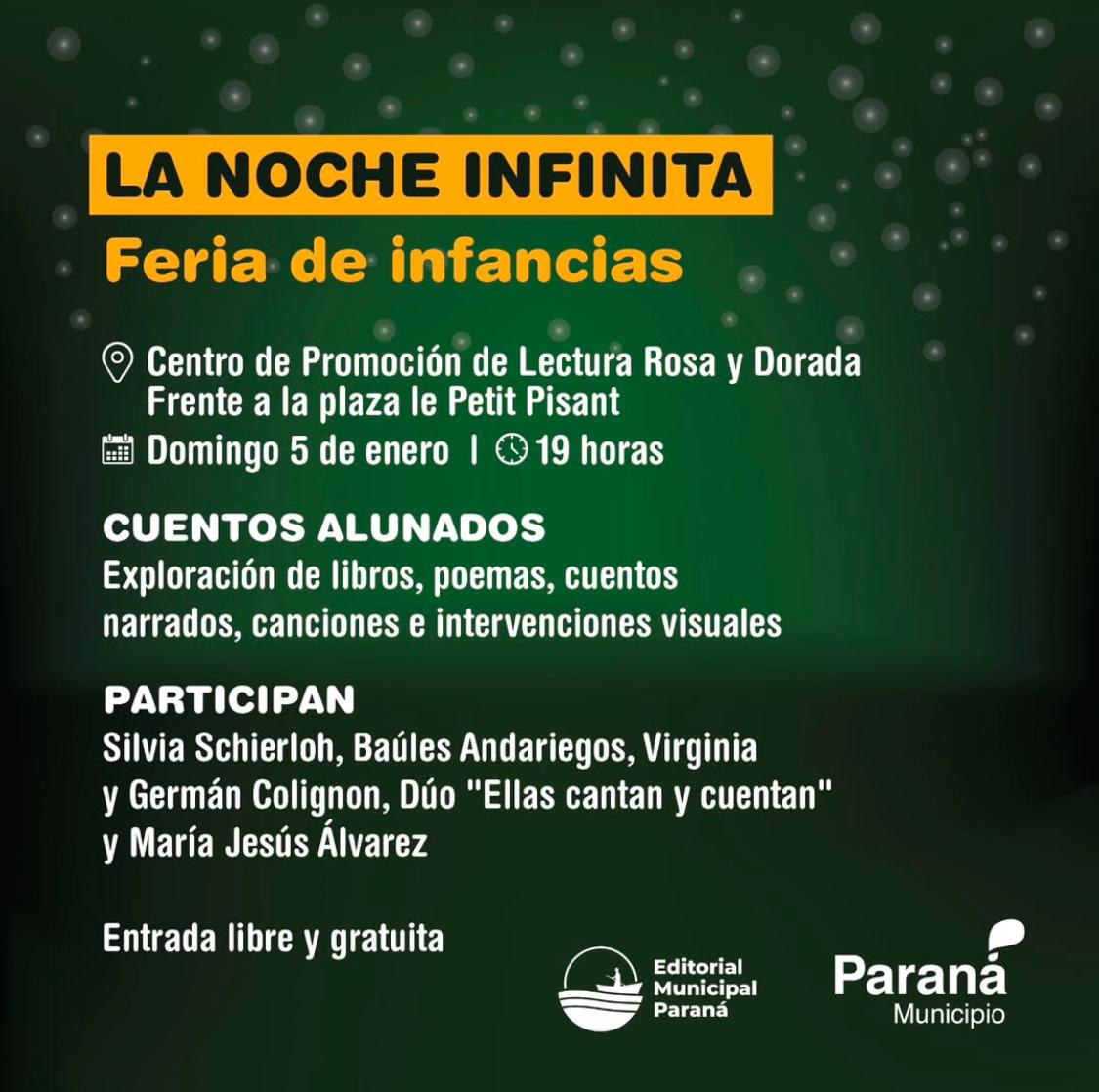 La Editorial Municipal de Paraná presenta "La noche infinita: feria de infancias", un encuentro con los libros, la música y la fantasía.
