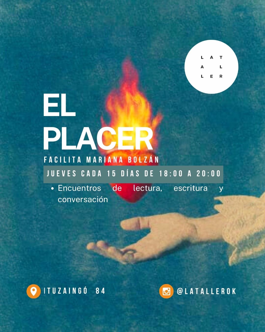 La escritora y docente Mariana Bolzán coordinará "El placer", un taller anual de lectura y escritura que se desarrollará de marzo a noviembre en La Taller (Ituzaingó 84). Los encuentros serán cada 15 días, los jueves de 18 a 20 h. Comienza el 13 de marzo.
