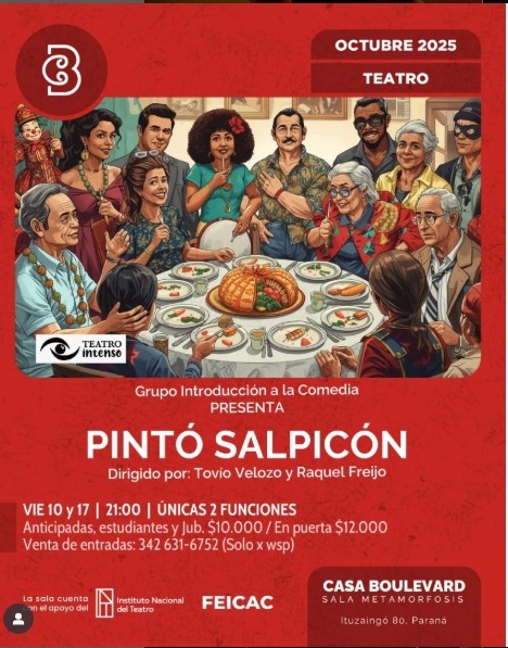 El viernes 10 y el viernes 17 de octubre, a las 21, en Casa Boulevard, Ituzaingó 80 de Paraná, el Grupo Introducción a la Comedia presenta “Pintó Salpicón”, una propuesta de Teatro Intenso que promete dos noches únicas de risas y energía escénica.
