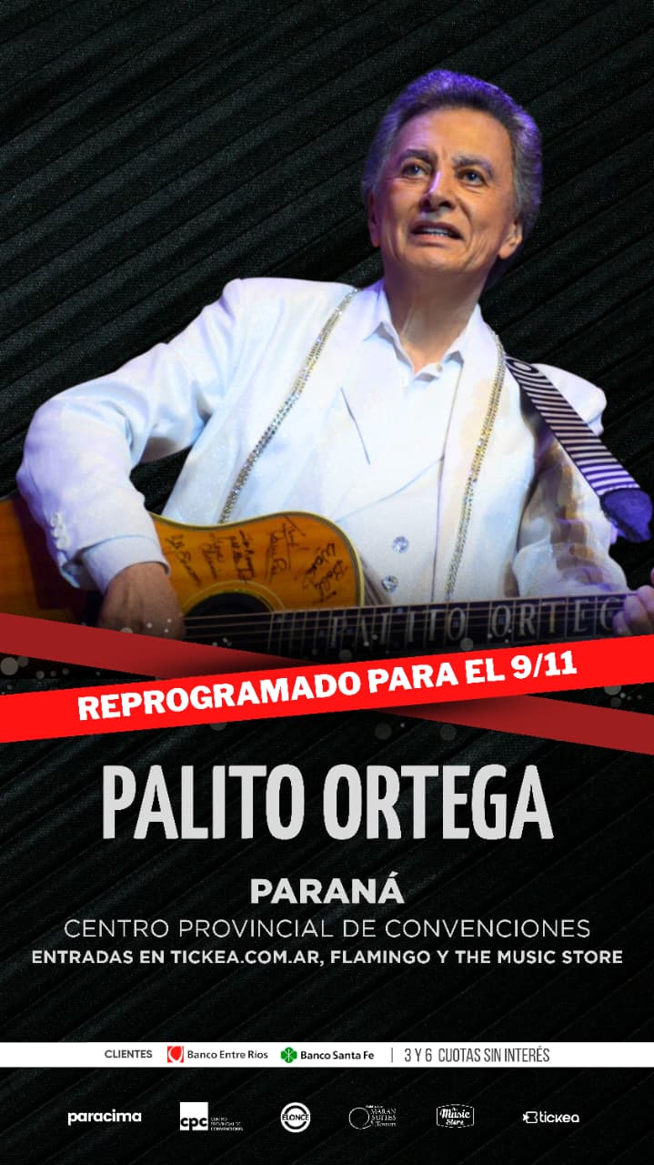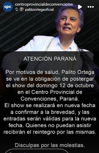 Por motivos de salud, Palito Ortega se ve en la obligación de postergar el show que se iba a realizar este domingo 12 de octubre en el Centro Provincial de Convenciones, Paraná.