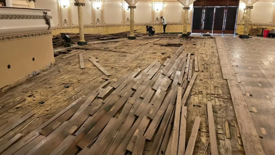 La obra comprende la extracción total de los tablones que conforman el piso de la sala, muchos de los cuales serán recuperados y reinstalados una vez que finalicen las reparaciones estructurales. Cinco operarios trabajan en la remoción del material existente que se encuentra afectado por el paso del tiempo y por la acción de insectos que se alimentan de la madera. Los tablones serán sometidos a un proceso de limpieza y restauración, mientras que el material dañado será reemplazado por nuevos componentes que aseguren mayor estabilidad.