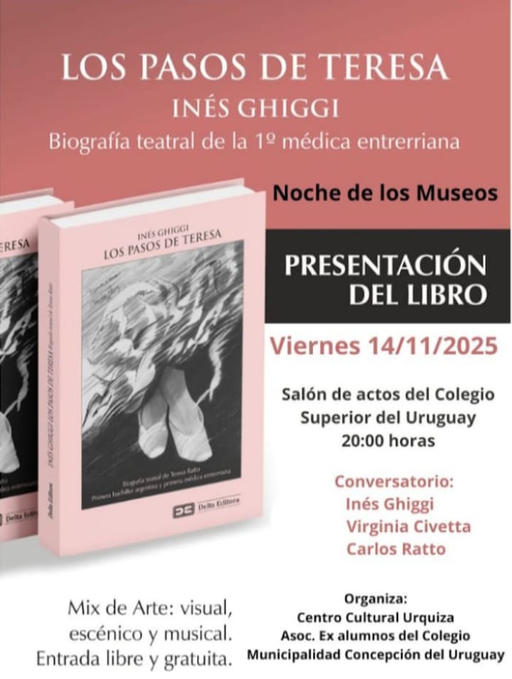 En el marco de La Noche de los Museos, este viernes 14 de noviembre a las 20, se presentará en Concepción del Uruguay el libro “Los pasos de Teresa”, escrito por Inés Ghiggi. El encuentro tendrá lugar en el Salón de Actos del histórico Colegio Superior del Uruguay Justo José de Urquiza, con entrada libre y gratuita.