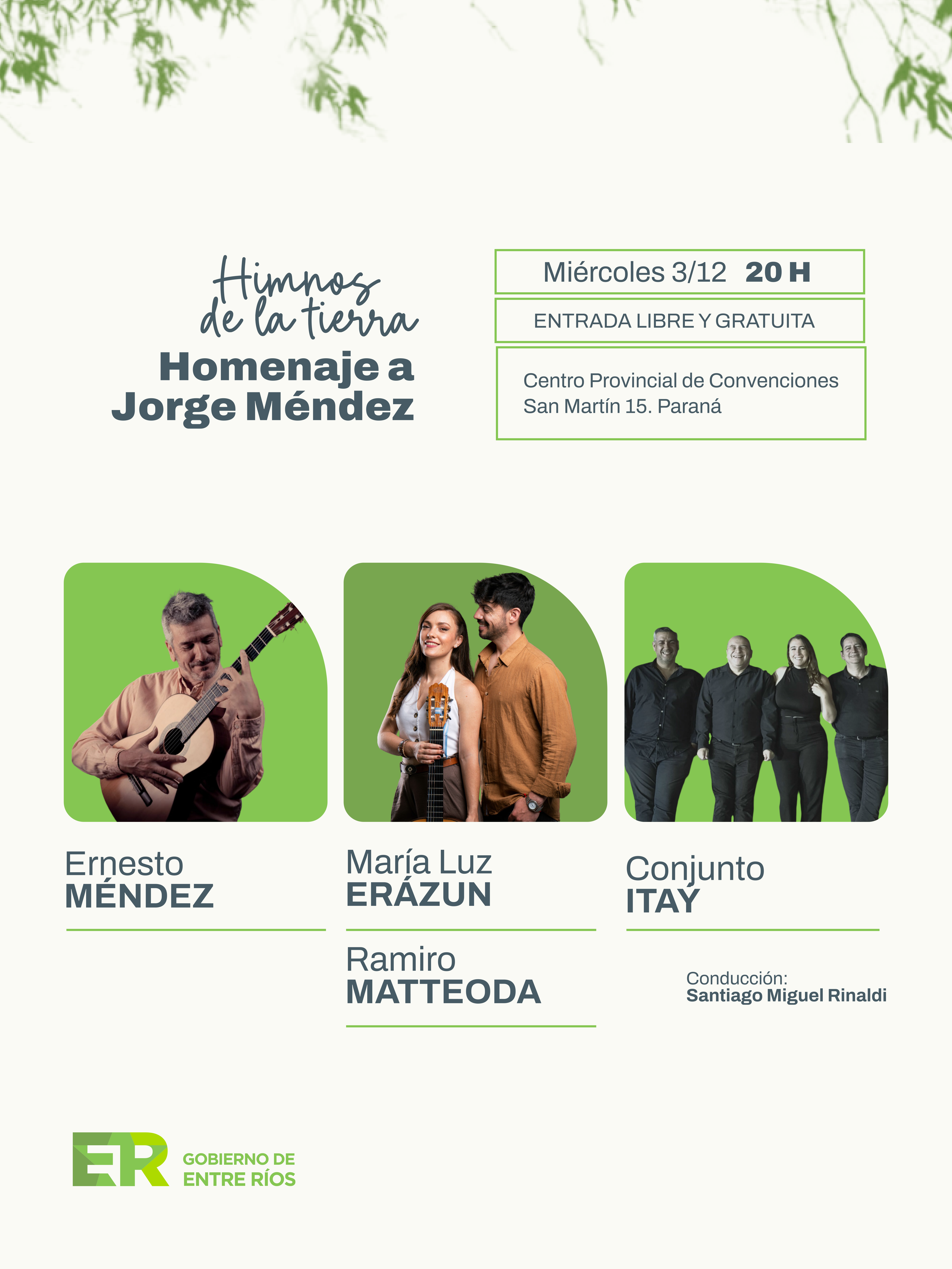 Ernesto Méndez nació en Paraná y tiene una destacada trayectoria como compositor y arreglador. Ha sido parte de festivales en Argentina, Brasil, Uruguay, Reino Unido y Alemania. Se ha presentado en salas de prestigio como el Royal Festival Hall de Londres, el Centro de Estudios Iberoamericanos de Berlín y el Teatro Colón de Buenos Aires. Es hijo de Jorge Méndez.