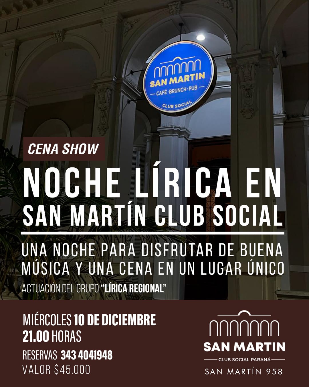 El próximo miércoles 10 de diciembre a las 21, San Martín Club Social será escenario de una nueva propuesta cultural y gastronómica: una Noche Lírica que combinará música en vivo y una cena por pasos. El encuentro tendrá lugar en la sede ubicada en San Martín 958, en pleno centro de Paraná.
