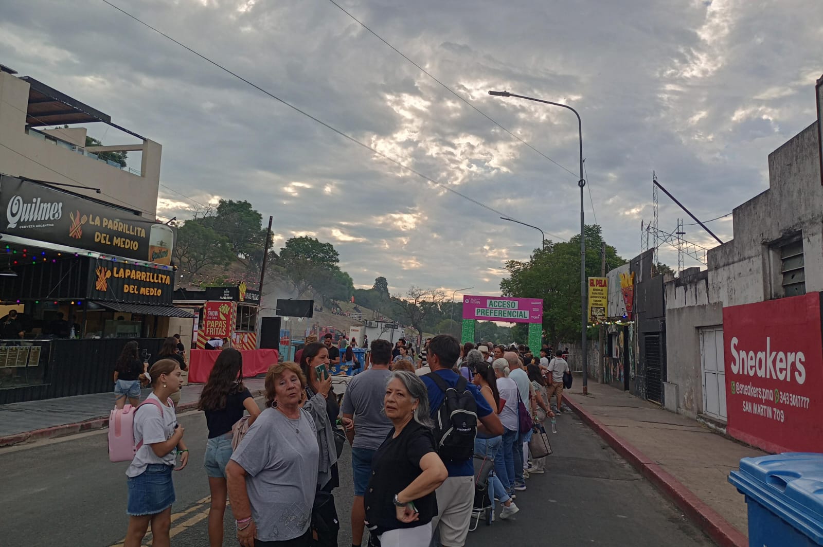 La cola del acceso preferencial sobre calle Laurencena comienza a estirarse. Algunos llegan temprano para asegurarse un buen lugar. Otros miran el movimiento desde afuera, dudan, preguntan cuánto falta para que abran o si todavía se consigue silla cerca del escenario. Las primeras filas empiezan a ocuparse con esa paciencia de quien sabe que la noche va a ser larga.