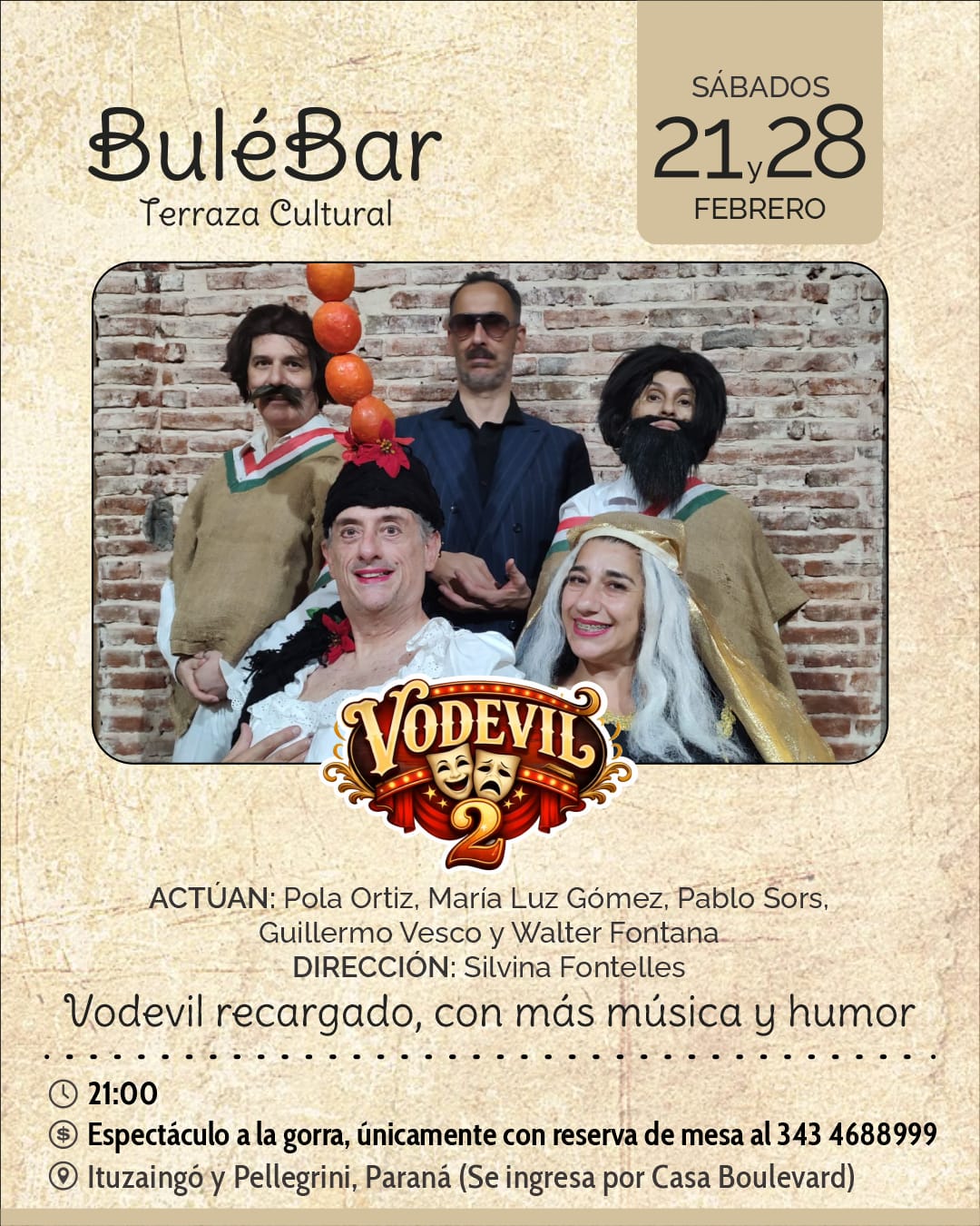 La comedia y la música se combinan en una nueva propuesta teatral que desembarca en Paraná. La obra “Vodevil 2” se presentará los sábados 21 y 28 de febrero a las 21, en la terraza cultural de BuléBar.