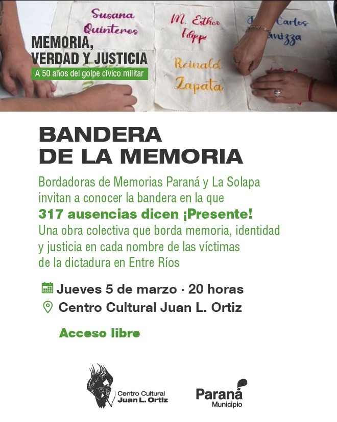 En el marco de las actividades por los 50 años del golpe cívico-militar, este jueves 5 de marzo a las 20, se presentará la Bandera de la Memoria en el Centro Cultural Juan L. Ortiz, con acceso libre y gratuito. La convocatoria tendrá lugar en Racedo 250, de Paraná.