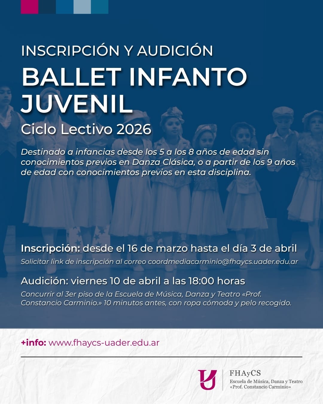 La Escuela de Música, Danza y Teatro “Profesor Constancio Carminio”, dependiente de la Facultad de Humanidades, Artes y Ciencias Sociales de la UADER, abrió la convocatoria para participar de la audición del Ballet Infanto Juvenil correspondiente al ciclo lectivo 2026.
