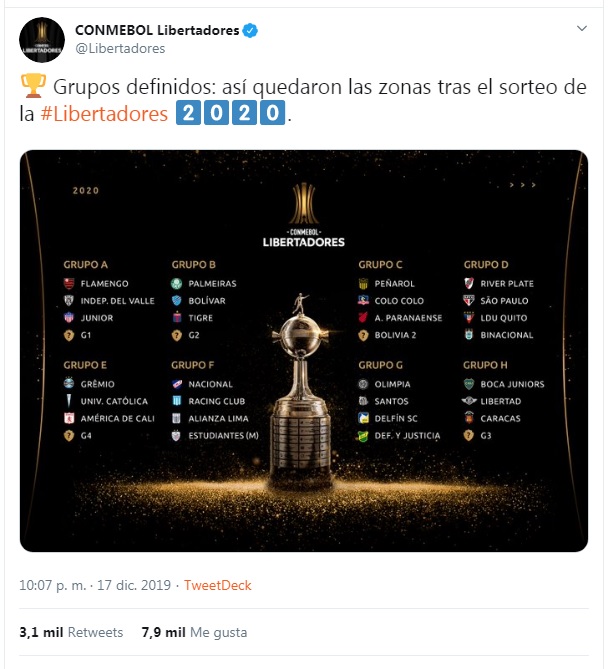 Se sorteó la Copa Libertadores 2020 en la ciudad de Luque, Paraguay, con 47 equipos en total y seis representantes argentinos: Racing (campeón de la Superliga), Defensa y Justicia (2°), Boca (3°), Tigre (Copa de la Superliga) y River (Copa Argentina), mientras que Atlético Tucumán jugará a partir de la segunda etapa previa.