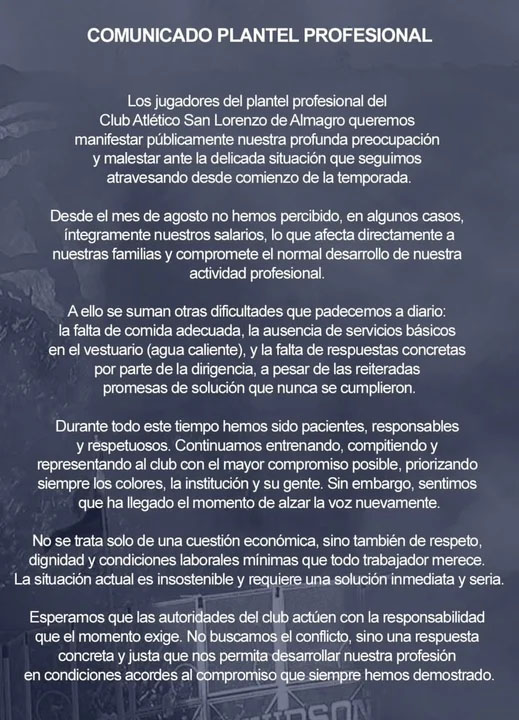 Los jugadores de San Lorenzo realizaron un fuerte comunicado en el que expresaron su “preocupación y malestar” y subrayaron que “llegó el momento de alzar la voz” por la situación que atraviesa el club.