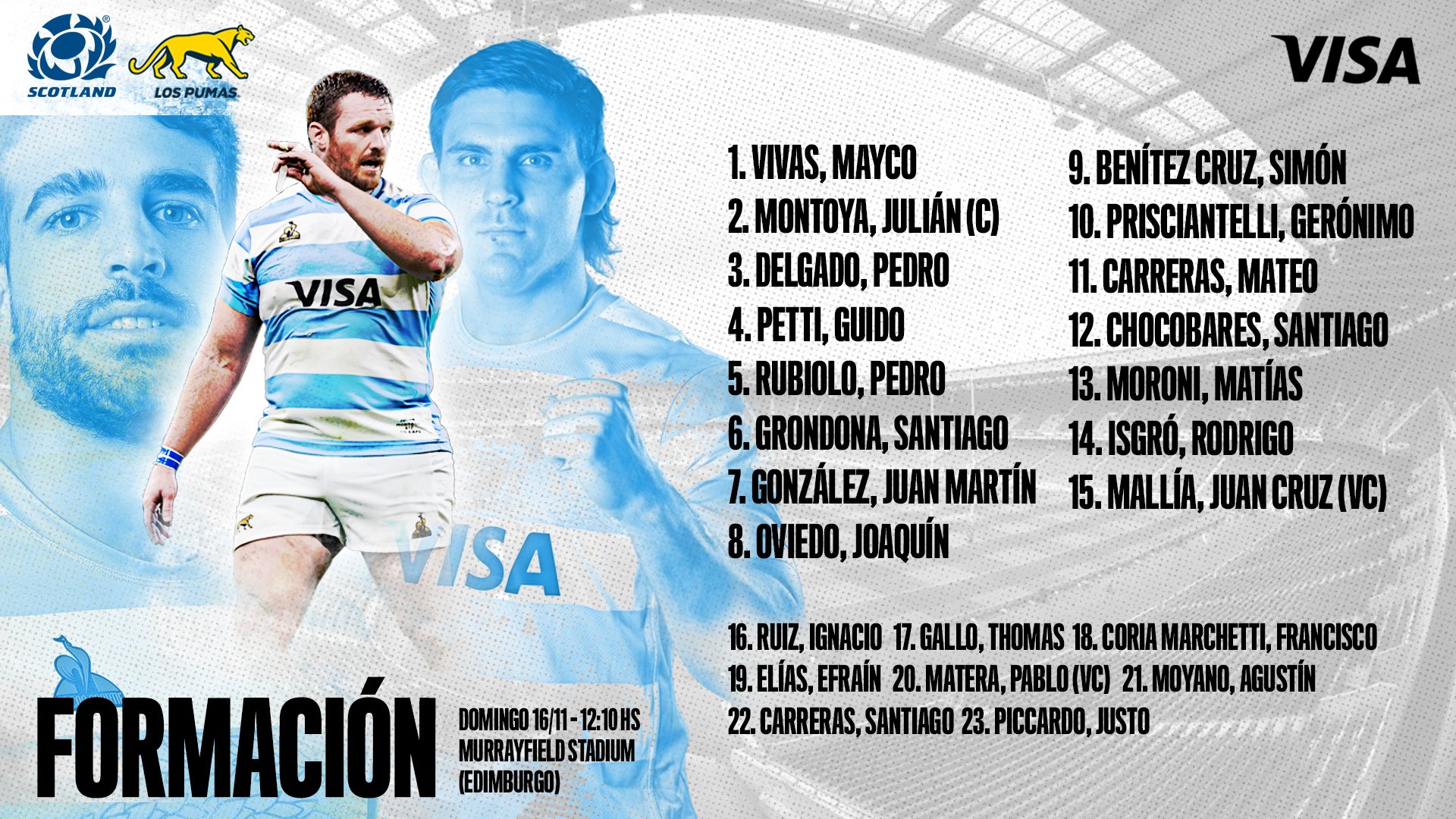 El entrenador Felipe Contepomi realizará cinco modificaciones en relación al equipo que actuó en Cardiff, ya que ingresarán Pedro Rubiolo, Santiago Grondona, Matías Moroni, Rodrigo Isgró y Juan Cruz Mallía en lugar de Marcos Kremer, Pablo Matera, Justo Piccardo, Bautista Delguy y Santiago Carreras.