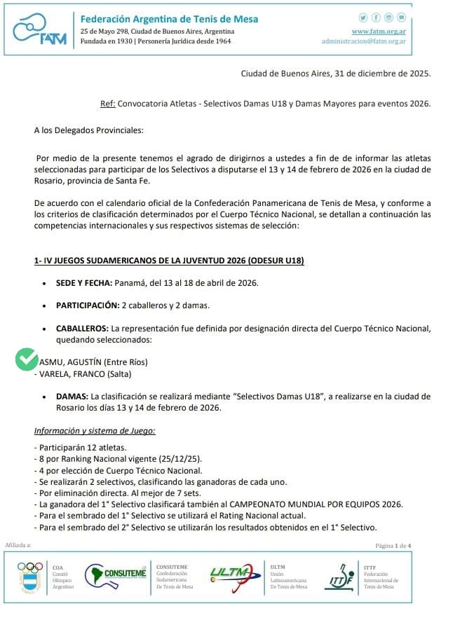 El paranaense Agustín Asmu fue designado por el cuerpo técnico de la Federación Argentina de tenis de mesa para participar en los IV Juegos Suramericanos de la Juventud. El evento se llevará adelante en Panamá, desde el 12 al 25 de abril.