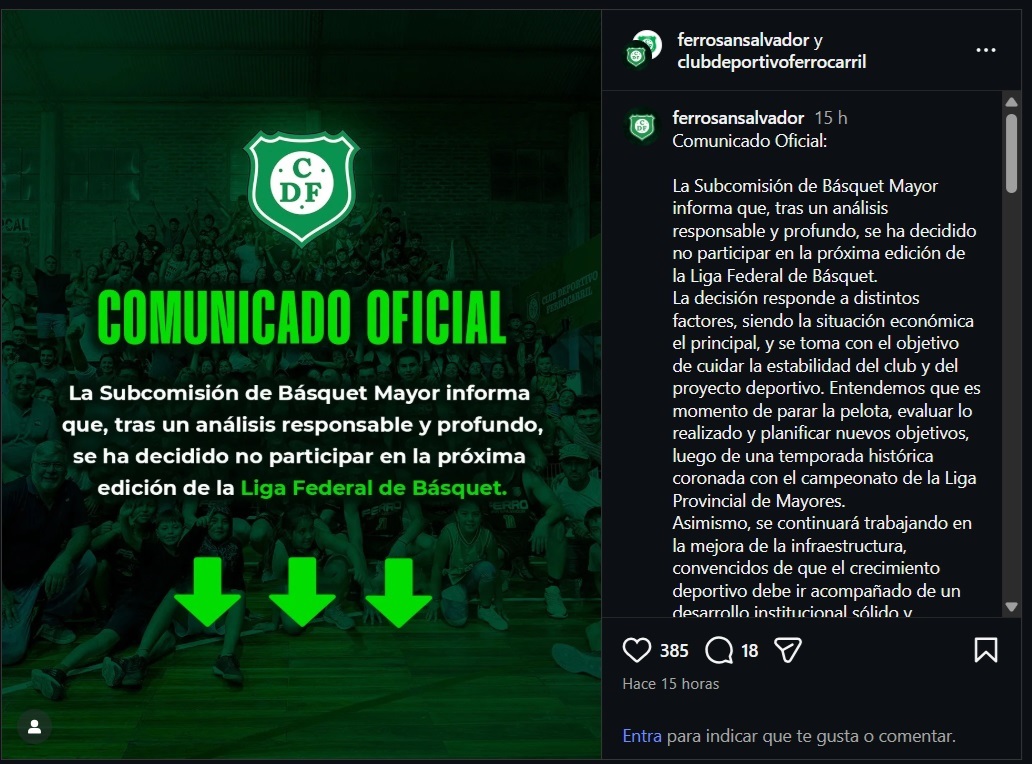 Sin embargo, el crecimiento deportivo chocó con una realidad económica compleja. Según pudo saberse, solo la inscripción a la Liga Federal ronda los $4.000.000, a lo que deben sumarse los salarios del plantel, los gastos de traslado, alojamiento y las obras de infraestructura exigidas por la Confederación Argentina de Básquet (CAB). En ese contexto, Ferro de San Salvador optó por no asumir compromisos que puedan poner en riesgo la estabilidad del club.