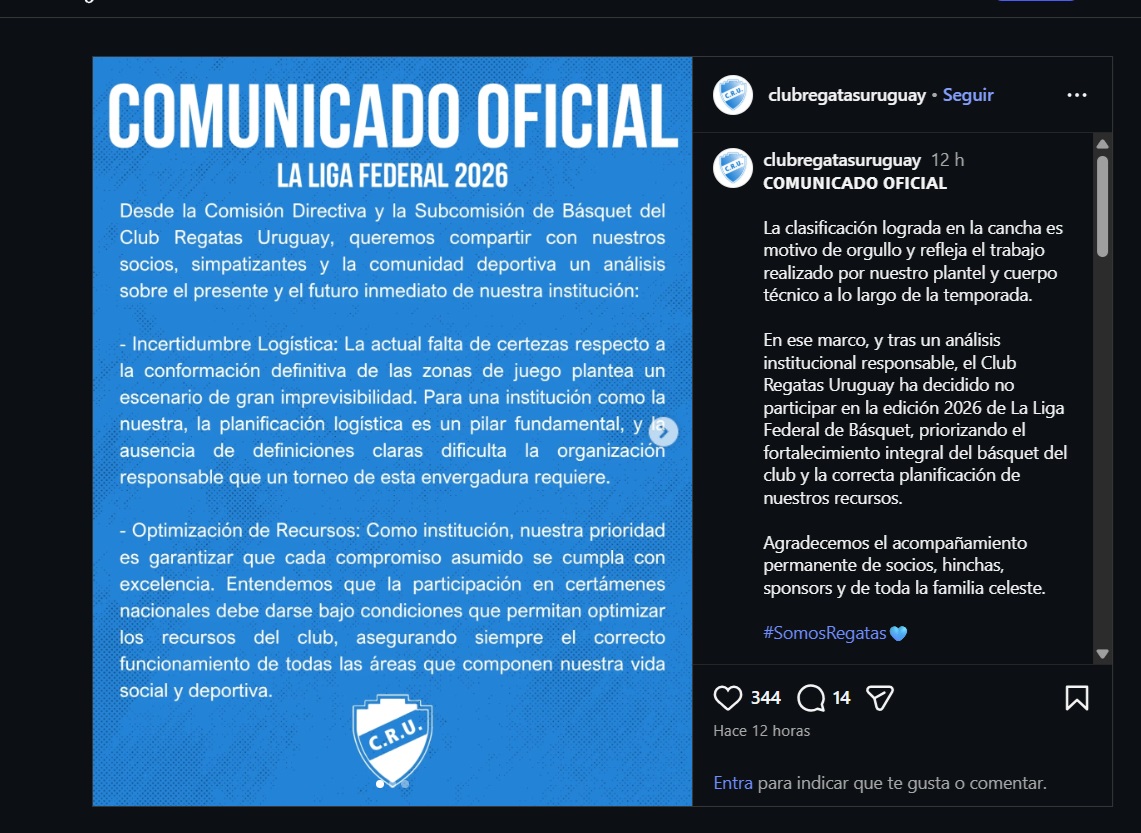 Enseguida agrega: “En ese marco, y tras un análisis institucional responsable, el Club Regatas Uruguay ha decidido no participar en la edición 2026 de La Liga Federal de Básquet, priorizando el fortalecimiento integral del básquet del club y la correcta planificación de nuestros recursos”, argumentó.