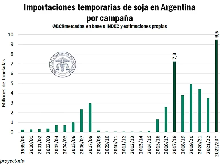 Un informe de la Bolsa de Comercio de Rosario (BCR) señaló que ante una caída de la producción de soja en la presente campaña, que se ubicaría en torno a los 25 millones de toneladas y sería la cosecha más baja de los últimos 23 años, las importaciones temporarias de soja para abastecer las necesidades de la industria de crushing se proyectan en 9,5 millones de toneladas. Es una cifra récord y superará los 7,3 millones de toneladas que el país importó durante la campaña 2017/18. A todo esto se suma el stock inicial que es de 6 millones de toneladas.