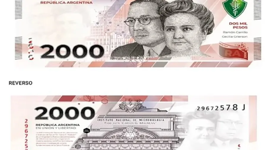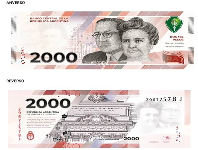 El nuevo billete de $2.000 será diseñado en colaboración con Casa de Moneda y se eligió a las figuras de los médicos argentinos Cecilia Grierson y Ramón Carrillo para ilustrar el anverso del billete, mientras que el reverso tendrá un homenaje al Instituto Nacional de Microbiología doctor Carlos Gregorio Malbrán.