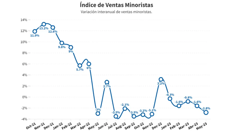 Con ese resultado, acumulan un declive del 1,7% en los primeros cinco meses del año. En la comparación mensual, los negocios también vendieron 1,2% menos que en abril.