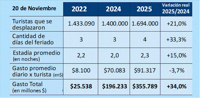 De acuerdo con el relevamiento de la Confederación Argentina de la Mediana Empresa (CAME), durante el fin de semana por el Día de la Soberanía Nacional se desplazaron 1.694.000 turistas por la Argentina, un 21% más que en el mismo feriado de 2024. El crecimiento se vio favorecido por la combinación de un clima templado, una agenda nacional muy activa y el formato de cuatro días, que amplió las posibilidades de viaje.