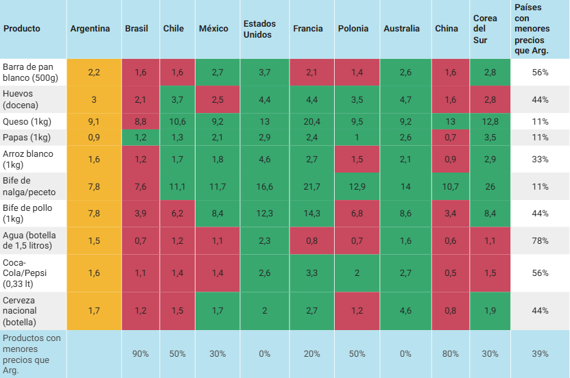 Al mismo tiempo, el reporte examinó diez productos de alimentos y bebidas en diez países. El resultado muestra que Argentina resulta más cara en el 39% de los casos. Brasil presentó precios inferiores a los argentinos en nueve de los diez productos analizados. En Chile y Polonia, cerca del 50% de los productos fueron más baratos que en el mercado nacional, mientras que en China esta proporción llegó al 80%.