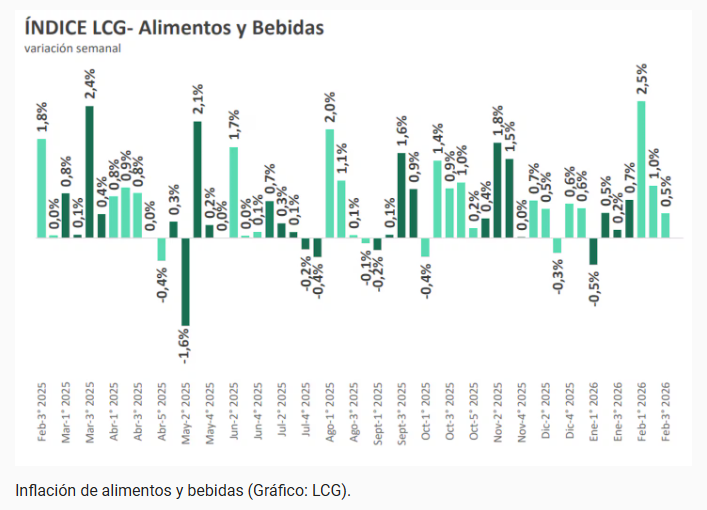 Mientras LCG midió un aumento de 0,5% semanal en la tercera semana de febrero, Analytica registró 0,8% para el Gran Buenos Aires en el mismo período. Las diferencias responden a metodologías y coberturas distintas, aunque ambas reflejaron una dinámica aún elevada en alimentos.