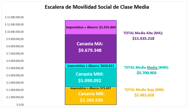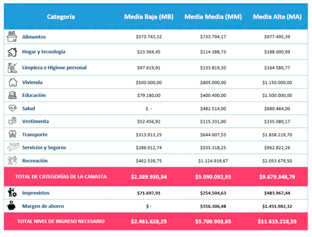 Para lograr una estimación realista, incorporamos un margen de imprevistos proporcional a la capacidad económica de cada segmento: 3% del valor total de la canasta en MB y 5% en MM y MA. También contemplamos un margen de ahorro diferenciado: inexistente en MB, de 5% a 10% en MM y de 15% a 20% en MA.