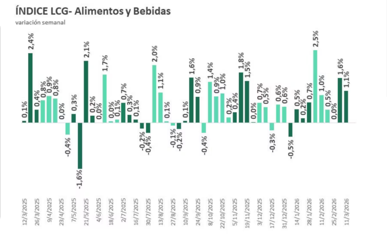 LCG precisó que el 75% de la inflación semanal se explicó por los aumentos en carnes y lácteos, que sumaron 1,1 puntos porcentuales sobre el promedio general, siendo un rubro que desde finales del 2025 presiona sobre el IPC. Además, el informe destaca que el 13% de los productos relevados en la canasta sufrió aumentos de precios en la semana, un porcentaje similar al de las últimas cuatro semanas y superior al promedio de meses anteriores.