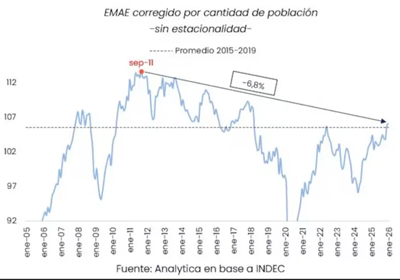 El analista afirma que "el gasto obligado también es 'consumo'". "Quiere decir que si suben tarifas, alquileres o prepagas el consumo sube, aunque no vivas mejor. Ahí está el punto", precisa el titular de CEPEC. Al referirse a declaraciones de Caputo en las que destaca que el consumo está en niveles mas altos desde 2017, el profesional sostiene que "el dato que da el ministro es correcto, ya que estadísticamente está en máximos, pero el gasto obligado también es 'consumo'”. Afirma que "más gasto no siempre es más consumo 'real'" ya que "a veces es solo pagar más caro lo mismo, y por eso, 'consumo récord' no implica mejor vida". "El crecimiento del consumo está más explicado por servicios (de carácter obligatorio) que por una expansión del consumo de bienes", señala Anzalone. En las ultimas horas el presidente Javier Milei salió a cuestionar a economistas que sostienen que dado el enfriamiento de la economía y la alta tasa de inflación persistente, la política económica debería enfocarse en recuperar dinamismo. En su cuenta X, Milei ratificó su idea de que la baja de la inflación seguirá siendo prioridad de su gestión y, para ello, cuestiona el concepto de la denominada Curva de Phillips. Se trata de un modelo desarrollado en 1958 por el economista inglés William Phillips, quien demostró que en el corto plazo si hay más inflación el desempleo baja. Este principio es el que usan organismos como la Reserva Federal o el FMI para determinar niveles de inflación y de desempleo óptimos. "Puedo entender que alguien precario pueda seguir creyendo en la Curva de Phillips y que hay trade-off entre inflación y desempleo (actividad) aunque ya la teoría económica la haya sepultado en 1968 y terminado de rematar entre 1972 y 1973. (Friedman/Phelps/Robert Lucas Jr.). De ahí a saltar a una relación positiva entre la inflación y el crecimiento es un disparate tanto en lo teórico como en lo empírico", señaló el primer mandatario. Al respecto, un asesor financiero y agente matriculado de la Comisión Nacional de Valores (CNV), Pablo Das Neves, le respondió a Milei: "Friedman y Phelps no 'sepultaron' la Curva de Phillips, lo que hicieron es una demostración de que la curva de largo plazo es vertical. Eso es distinto. La curva de corto plazo con rigideces nominales sigue, y de hecho es el núcleo de los modelos que usan la Fed, el BCE, el FMI y cualquier banco central serio hoy", indicó. Otro dato a precisar es el de la pobreza, el cual registró una caída al 28,2% en el cierre de 2025, cifra que marca también uno de los niveles más bajos. Economistas plantean que los datos de INDEC están influidos por algunos cambios metodológicos. Desde 2024 el organismo logra captar mejor ingresos provenientes de programas sociales, que antes estaban subcaptados. También se afirma que el incremento del 25% de los salarios del sector no registrado de la economía -un concepto que ya de por sí es polémico- se debe a una cuestión metodológica. Si el año pasado los salarios en negro subieron no se debería a que la gente cobró más sino a que antes este dato no se estaba registrando correctamente. Y, además, se señala que, como el INDEC sigue con la canasta de consumo y ponderadores de 2004 y 2005, las líneas de pobreza e indigencia deberían ser más altas que las que reporta actualmente el INDEC. El ultimo informe del Estimador Mensual de la Actividad Económica (EMAE) del INDEC indica muestra un crecimiento del 6,4% desde el momento que asumió el actual Gobierno. El índice también tiene cuestiones a ver. No todos los sectores crecen de igual modo y algunos están en caída, lo que se configura como una economía dual en forma de letra K. En diciembre el EMAE subió 1,8% y en enero otro 0,4%. Pero la consultora Analytica, del economista Ricardo Delgado, hizo una medición de la actividad por habitante. Y el resultado es que cayó 6,8% entre septiembre de 2011 y enero de 2026. “Estos niveles de actividad no se traducen en un bienestar en máximos históricos”, señaló la consultora Analytica. En promedio, la actividad es similar a la que había entre 2015 y 2019, pero con más población.