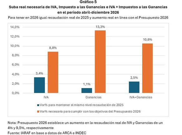 Un punto a tomar en cuenta es que el Presupuesto 2026 preveía para este año un incremento de la recaudación del 4% en el IVA y del 9,5% en Ganancias.