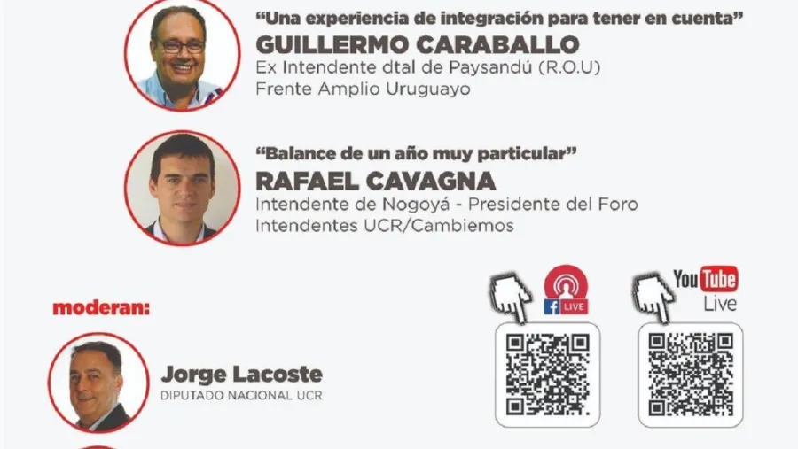 El ciclo de charlas virtuales que ha venido desarrollando Convergencia a lo largo de este año 2020, cerrará este lunes con dos destacados expositores: el ex Intendente del departamento Paysandú (República Oriental del Uruguay), Guillermo Caraballo y el presidente del Foro de Intendentes de Cambiemos e intendente de Nogoya, Rafael Cavagna (UCR).