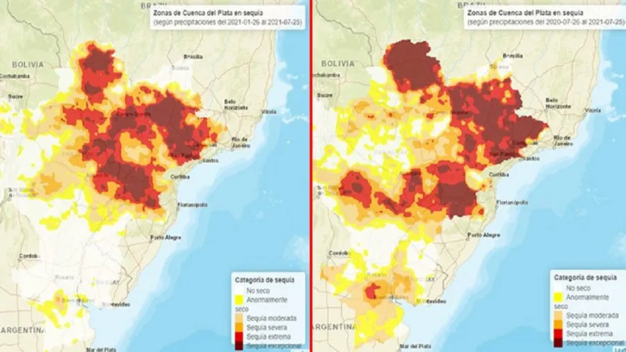 Hoy, el 75 % del área de la cuenca del Paraná está afectada por sequías moderadas a excepcionales, lo que equivale a aproximadamente a 70 millones de hectáreas.