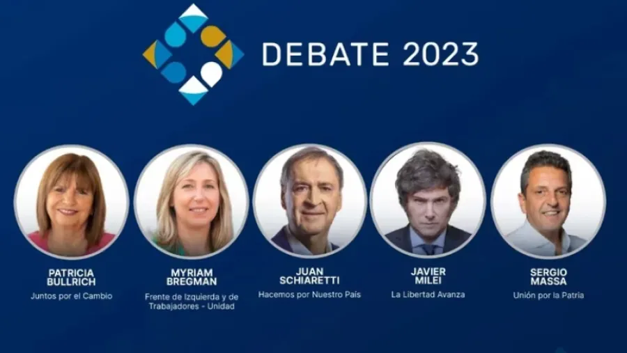 La ley prevé dos debates obligatorios antes de las elecciones del 22 de octubre y serán protagonizados por Javier Milei (La Libertad Avanza), Sergio Massa (Unión por la Patria), Patricia Bullrich (Juntos por el Cambio), Juan Schiaretti (Hacemos por Nuestro País) y Myriam Bregman (Frente de Izquierda y Trabajadores-Unidad). Son los cinco candidatos que superaron el 1,5% de los votos válidos en las Elecciones Primarias, Abiertas, Simultáneas y Obligatorias (PASO). La expectativa por el debate es alta debido al final abierto del resultado electoral, en un escenario político de virtual empate entre los tres primeros: Milei, Massa y Bullrich.