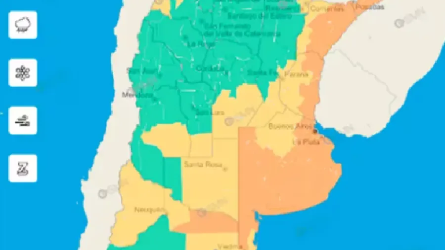 En algunas provincias rige una alerta amarilla, también por tormentas, pero en este caso de menor magnitud. Algunas regiones de Formosa, Mendoza, San Luis, La Pampa, Río Negro y Chubut, son las afectadas.