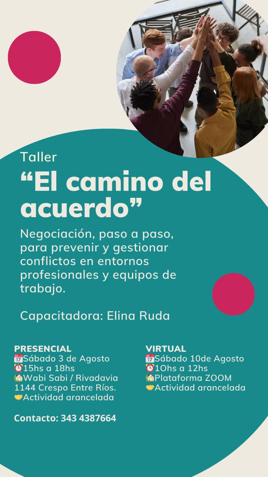 La capacitadora, Elina Ruda, coordinará un encuentro presencial el sábado 3 de agosto, de 15 a 18 en Wabi Sabi / Rivadavia 1144, Crespo, Entre Ríos. Y el sábado 10 de agosto, de modo virtual, de 10 a 12, a través de la plataforma Zoom.