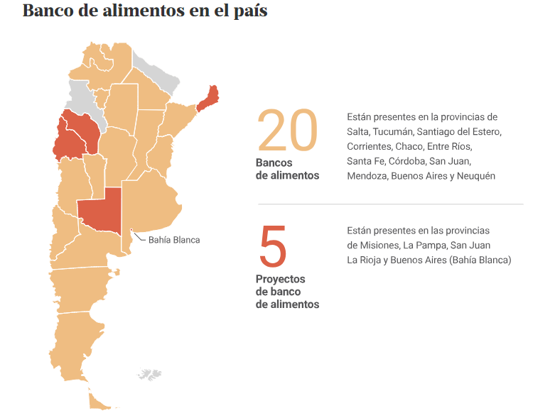 Actualmente hay 20 bancos de alimentos en la red argentina, distribuidos en 20 provincias, y cinco iniciativas, que son organizaciones que están en vías de convertirse en un banco de alimentos. A nivel local, la red de BAA el año pasado recuperó 16.850.782 kilos de alimentos. De ese total, el 68% tenía un alto valor nutricional. Con esa mercadería asistieron a 1.105.154 personas que se sentaron a comer en la vasta red de 4.449 organizaciones sociales adheridas, entre comedores e instituciones educativas, entre otras. Toda la red de BAA cuenta con 14.130 voluntarios.