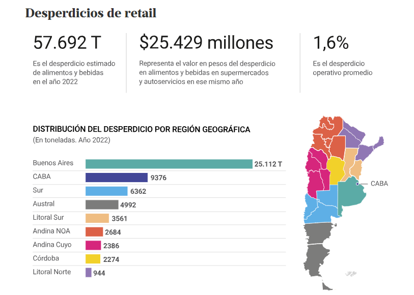 Cada año en Argentina se desperdician 16 millones de toneladas de alimentos, según la Organización de las Naciones Unidas para la Alimentación y la Agricultura (FAO), lo que equivale, si se pasa ese número a metros cúbicos, a aproximadamente 6.400 piletas olímpicas llenas de alimentos. De esta cifra, el 45% corresponde a la producción frutihortícola que se pierde y no llega a los consumidores. En 2022, se desperdiciaron 57.000 toneladas de alimentos solo en el sector retail, de acuerdo con el tablero de mermas elaborado por la organización sin fines de lucro, GS1. Estos altos niveles de desperdicios se dan en el marco de un país que, según el Observatorio de la Deuda Social Argentina (ODSA) de la Universidad Católica Argentina, que utiliza una metodología diferente a la del Instituto Nacional de Estadística y Censo (Indec), en el primer trimestre de este año tuvo un 55,5% de pobreza. La indigencia, por su lado, aumentó al 17,5%.