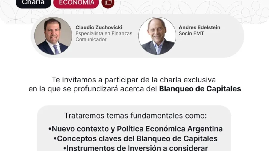 Zuchovicki y Edelstein abordarán tópicos como el nuevo contexto y política económica en Argentina, los conceptos claves del blanqueo de capitales y las diversas opciones de instrumentos de inversión. Los interesados podrán participar de la charla desde el canal de YouTube de Grupo Petersen: https://www.youtube.com/@gppetersen7/.