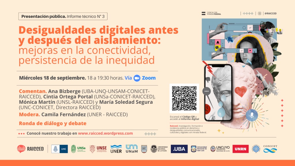 “Desigualdades digitales antes y después del aislamiento: mejoras en la conectividad, persistencia de la inequidad” es un informe de investigación desarrollado por la Red de Investigadores e Investigadoras en Comunicación y Cultura con Enfoque de Derechos (RAICCED) y se realizó con financiamiento del Consejo Nacional de Investigaciones Científicas y Técnicas (Conicet). Será el miércoles 18 de septiembre a las 18, a través de la plataforma Zoom. https://us02web.zoom.us/j/87673494530?pwd=X8TCbEX5ioj9Falf102TuxVF6a4myh