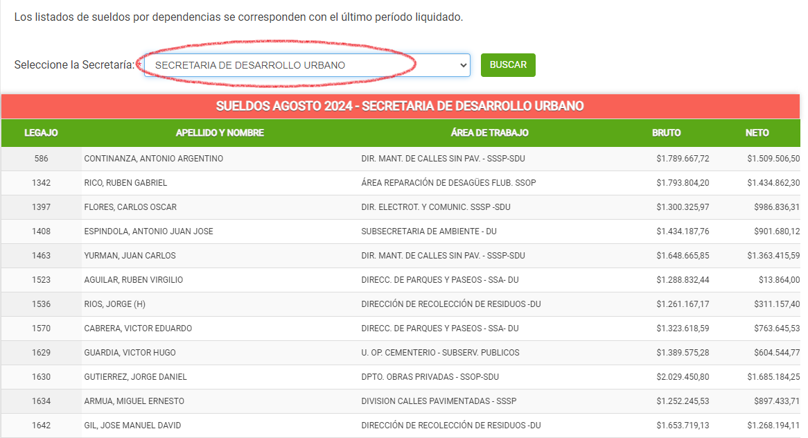 - La Secretaría de Desarrollo Urbano reconoce 967 empleados. Del área dependen arquitectura, recolección de residuos, obras sanitarias, talleres, depósitos, parques y paseos, puerto, entre otros. El sueldo más alto de agosto fue de 1 millón 743 mil 274 pesos. Hay personal que en agosto, bajo esta dependencia cobró 1000 pesos, pero en sueldos brutos de más de un millón o de más de 500 mil pesos.