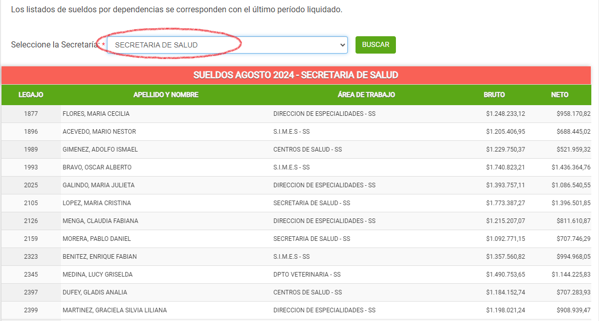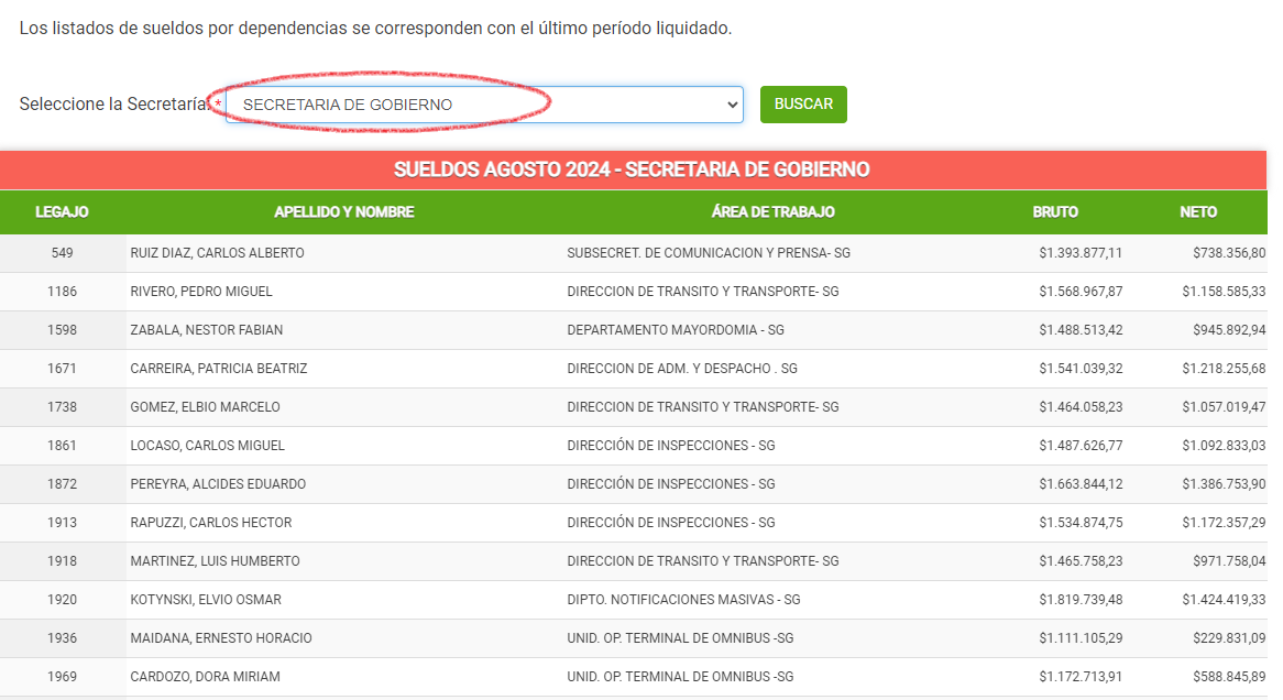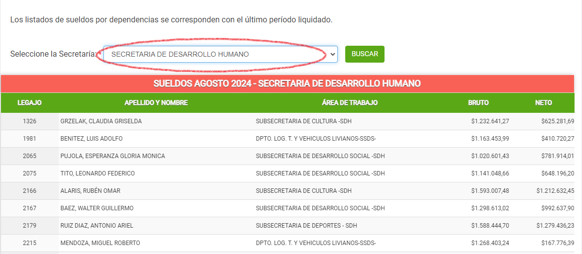 - La misma información se publica en la Secretaría de Desarrollo Humano de la Municipalidad de Concordia. Es una nómina compuesta por 383 empleados dependientes de distintas áreas como Cultura, Niñez y Adolescencia, Deportes, Desarrollo Social, museos, Logística y Vehículos Livianos, entre otros. El salario más elevado para agosto fue el del secretario de Desarrollo Humano, con 2 millones 340 mil 962 pesos; y el haber más bajo dependiente de la Secretaría fue de 176 mil pesos.