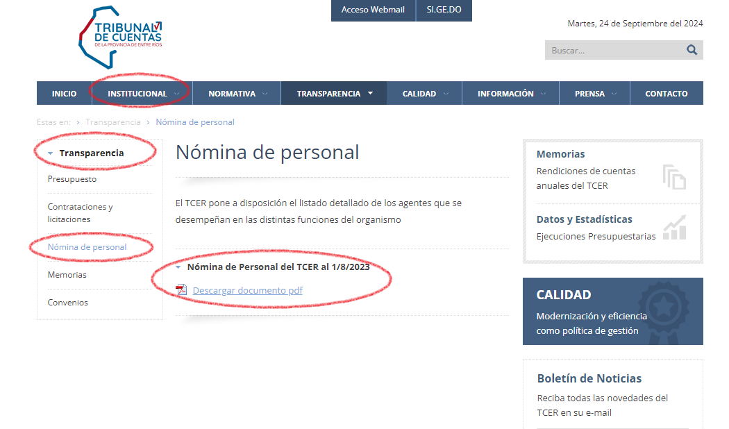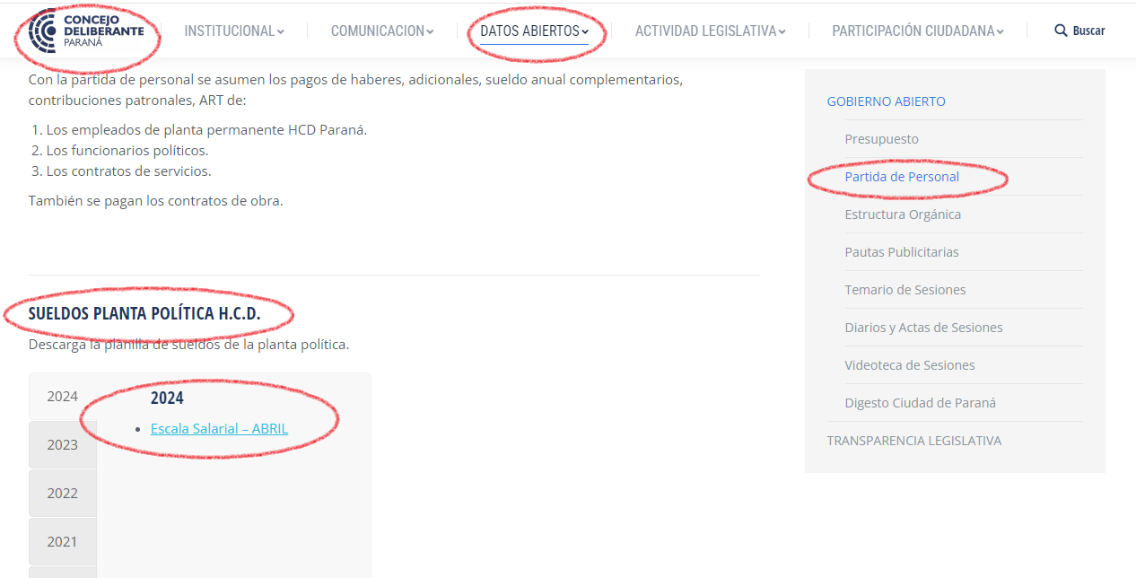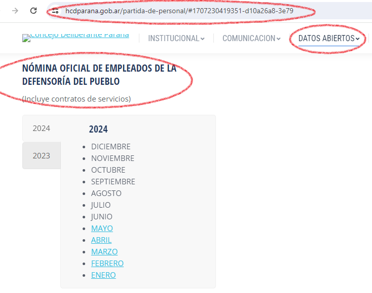 - Defensoría del Pueblo de Paraná. Sabido es que depende del Concejo Deliberante. Se entra a la página del Concejo. Hay un menú llamado Datos Abiertos que contiene Presupuesto, Pautas Publicitarias, Contratación y Licitaciones, Concursos Administrativos. Entre esos tópicos hay un apartado llamado Partida de Personal. Es necesario ir al pie de página para encontrar el listado de empleados de la Defensoría del Pueblo de Paraná, que informa 19 personas trabajando en el organismo. La última actualización es de mayo de 2024.